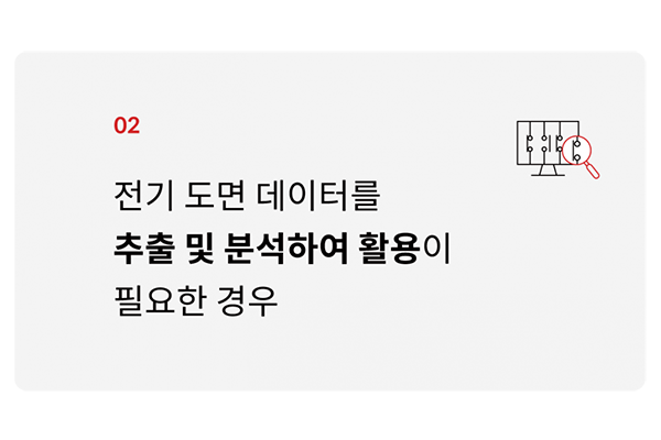 설계 도면에서 회로 간 충돌, 부적절한 배선, 규격 위반 등을 자동으로 검출할 수 있습니다. 빅데이터로 학습된 ‘오류 패턴’ 기반으로 접지 누락, 차단기 용량 오류, 과부하 배선 경고등의 설계를 검증할 수 있습니다. |